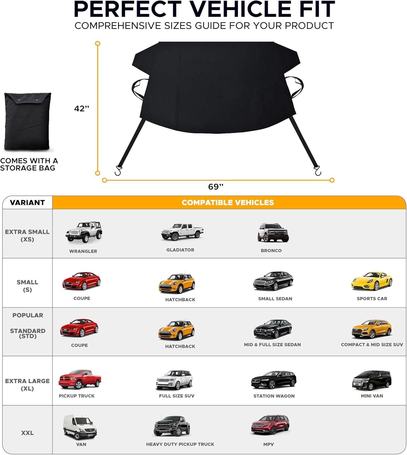 Compatible with Most Vehicles: Measuring 69 inches in length and 42 inches in height, this windshield cover provides full coverage. It also comes in two sizes to fit most cars, SUVs, vans, and trucks effortlessly!